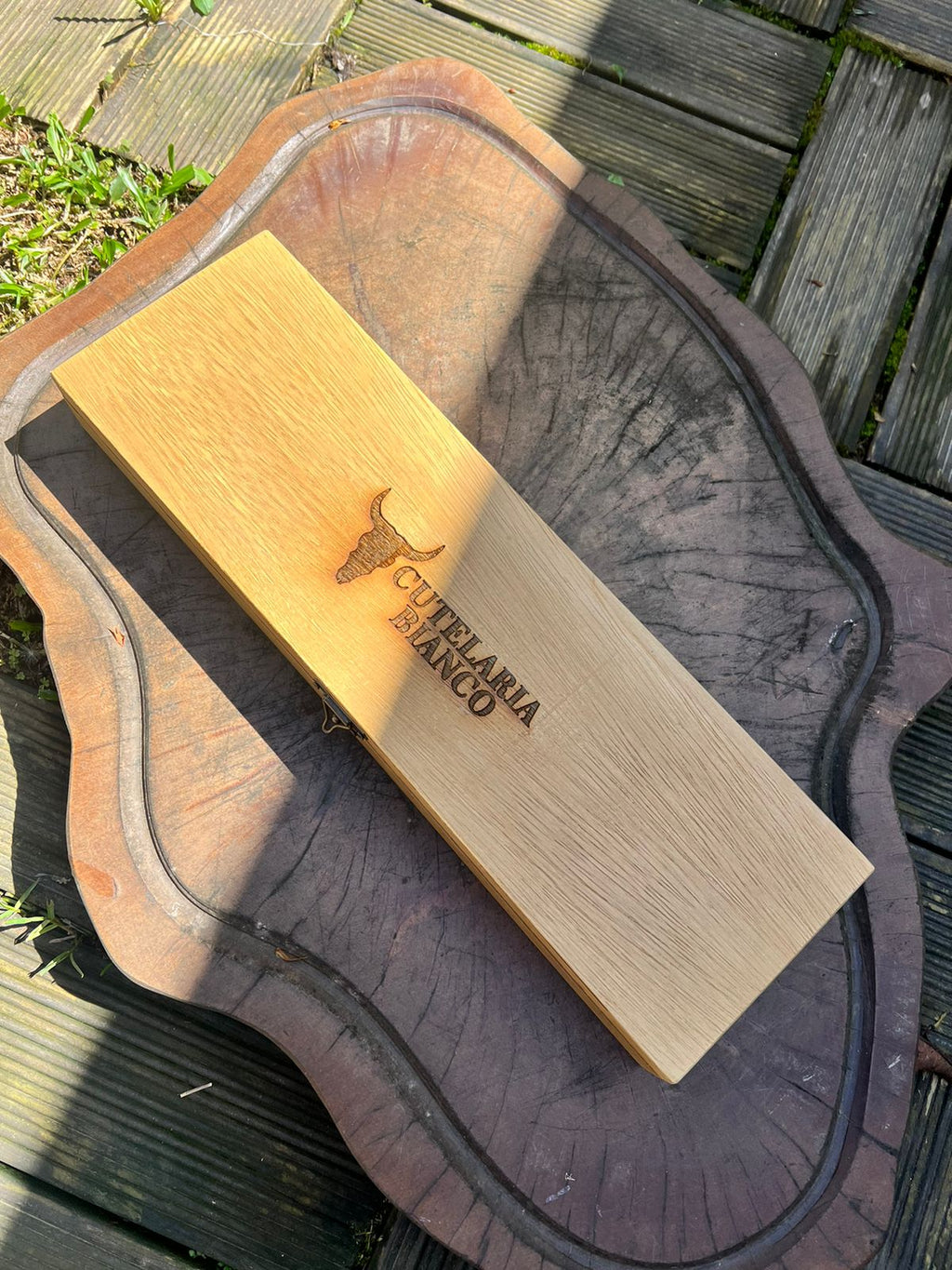 Imagina ter nas suas mãos uma faca forjada no estilo antigo, com lâmina de aço alemão 420 e dureza de 59-63 HCR, garantindo um corte perfeito todas as vezes. O cabo em madeira rara de Imbuia, proveniente de antigos mourões; é um convite ao luxo e à personalização.