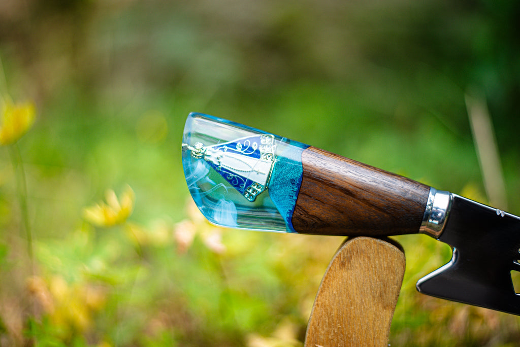 Cabo: Híbrido com cristal líquido importado e madeira de lei, oferecendo uma combinação exclusiva de design e durabilidade. Cada cabo é uma peça única, com acabamento manual e visual sofisticado.